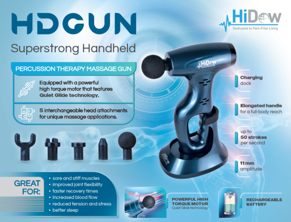 Experience the Percussion Therapy Massage Gun from HiDow with 5 interchangeable head attachments for a unique massage experience. Equipped with a powerful high torque motor and Quiet Glide technology, this is the perfect massage gun for at home or on the go.